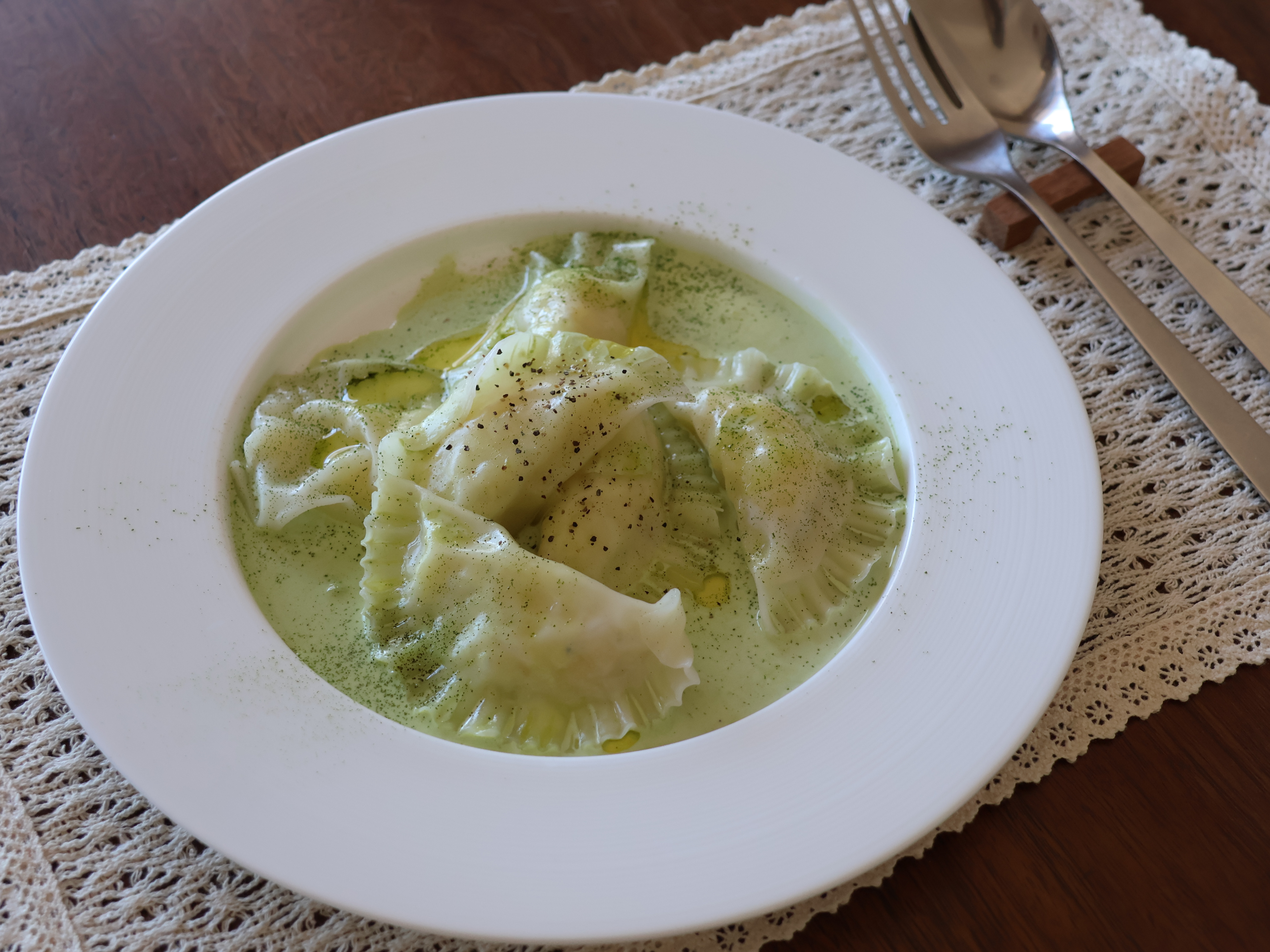 餃子をラビオリに見立て、抹茶ソース仕立てにしたアイデアが良く、ラビオリを包む工程は親子で楽しくできる料理です。